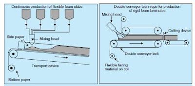 - Sản xuất mút khối mềm liên tục (trái) và sản xuất panel, tấm lợp liên tục (hình phải)